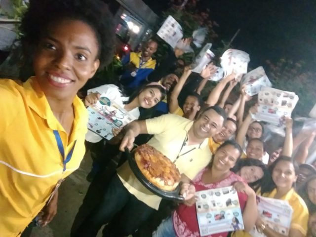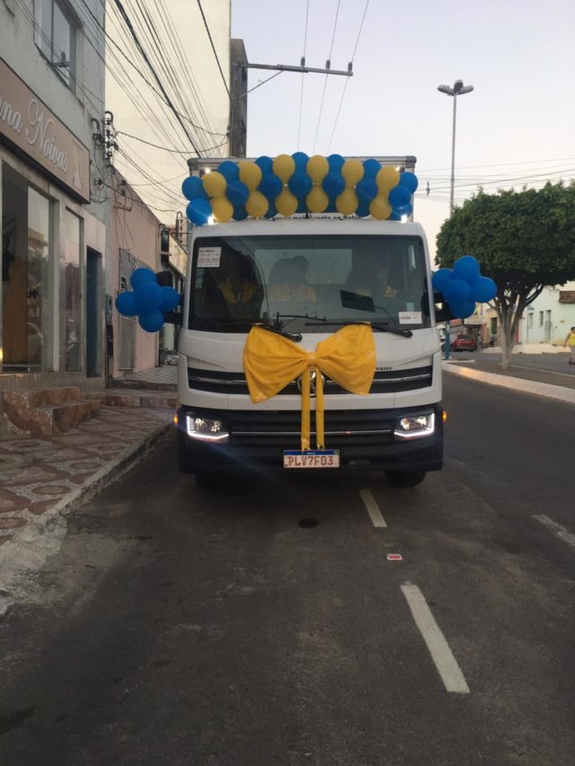 O caminhão percorreu algumas ruas da cidade até chegar à residência de Liliane, que recebeu a equipe com um delicioso bolo.