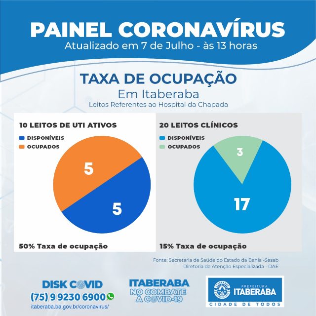 De acordo com o Boletim Oficial 07/07, até as 13h de hoje, os números da Taxa de Ocupação Leitos Clínicos e de Unidades de Terapia Intensiva (UTI) no município, com dados da Secretaria da Saúde do Estado da Bahia (Sesab), são os seguntes: dos 10 leitos de UTI ativos, 5 estão ocupados (50%); ao passo que, dos 20 leitos clínicos, 3 estão ocupados atualmente (15%).