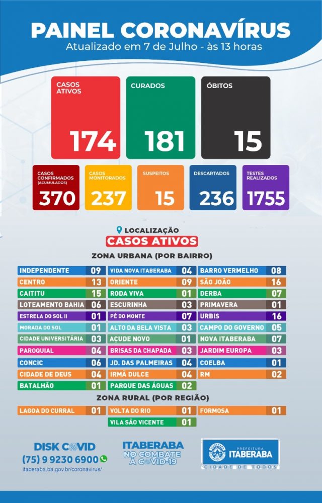 A Prefeitura de Itaberaba, através da Secretaria Municipal de Saúde (Sesau), assim como da Coordenação de Vigilância em Saúde e da Câmara Técnica (CT) de enfrentamento da pandemia do novo coronavírus, informa o Boletim Oficial 07/07 que, nesta terça-feira (7), registrou 25 novos casos da COVID-19. Por outro lado, o número de pessoas curadas registrou um aumento de 7,74%, passando de 168 a 181 casos, mantendo-se acima do número de casos ativos em 4,02%. Além disso, foi registrado o 15º óbito pela doença.
