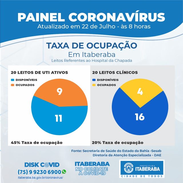 De acordo com o Boletim Oficial 22/07, até as 17h de terça-feira (21), os números da Taxa de Ocupação Leitos Clínicos e de Unidades de Terapia Intensiva (UTI) no município, com dados da Secretaria da Saúde do Estado da Bahia (Sesab), são os seguintes: dos 20 LEITOS DE UTI ATIVOS, 9 estão ocupados (45%); ao passo que, dos 20 LEITOS CLÍNICOS, 4 estão ocupados atualmente (20%). A taxa de ocupação geral é de 32,5%.