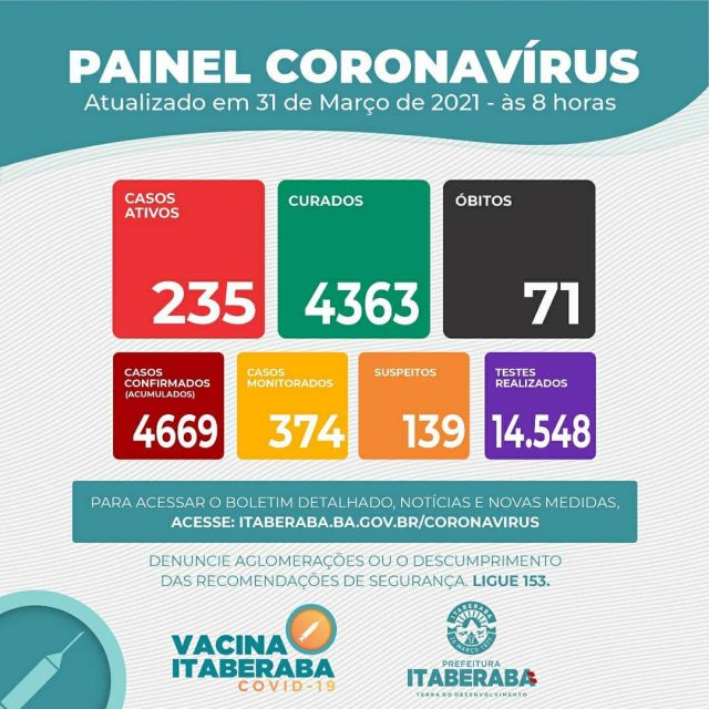 Atualmente Itaberaba tem 235 casos ativos, 139 casos suspeitos, 374 casos monitorados e 71 óbitos registrados pela doença. O número de casos curados é de 4.363 e, ao todo, já foram confirmados 4.669 casos da COVID-19 no município. Além disso, já foram realizados o total de 14.548 exames, dentre Testes Rápidos e RT-PCR/SWAB.