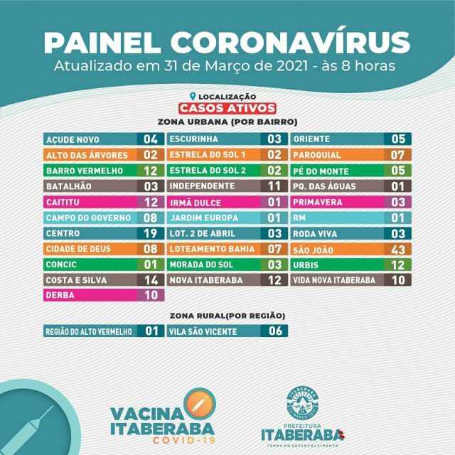A Prefeitura de Itaberaba, por meio da Secretaria Municipal da Saúde, informa o boletim diário de quarta-feira (31) com dados consolidados até as 17h de terça-feira (30).
