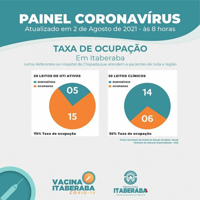 De acordo com o boletim diário de segunda-feira (02) e do Estado da Bahia – SESAB, atualmente os números da taxa de ocupação de leitos no município são: 20 Leitos Clínicos, com 6 leitos ocupados, representando 30% de taxa de ocupação; 20 Leitos de Unidades de Terapia Intensiva – UTI, com 15 leitos ocupados, representando 75% de taxa de ocupação.