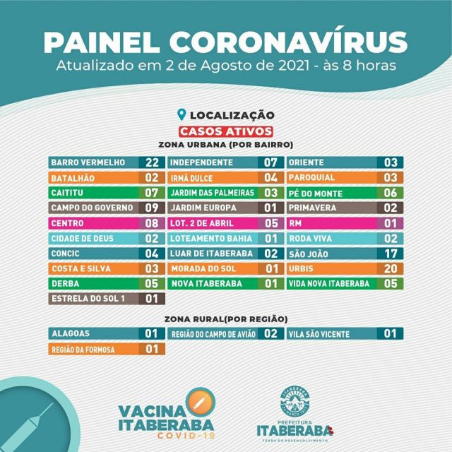 A Prefeitura de Itaberaba, por meio da Secretaria Municipal da Saúde, informa o boletim diário de segunda-feira (02) com dados consolidados até as 17h de domingo (01).