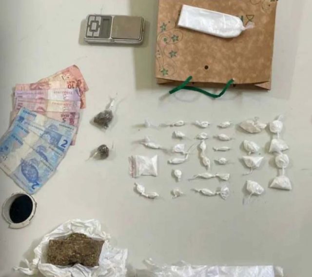 Com os infratores foram apreendidas 30 porções de cocaína, 2 de maconha, 1 balança de precisão, a quantia de R$ 43,00 e embalagens para droga.