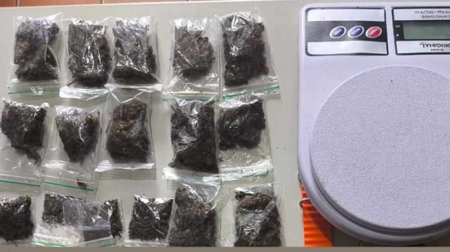 Na ação, foram apreendidas 16 porções de substância análoga à maconha, três celulares (dois da Motorola e um Samsung danificado), um smartwatch, uma balança de precisão branca, além de diversas embalagens utilizadas para comercialização de entorpecentes.