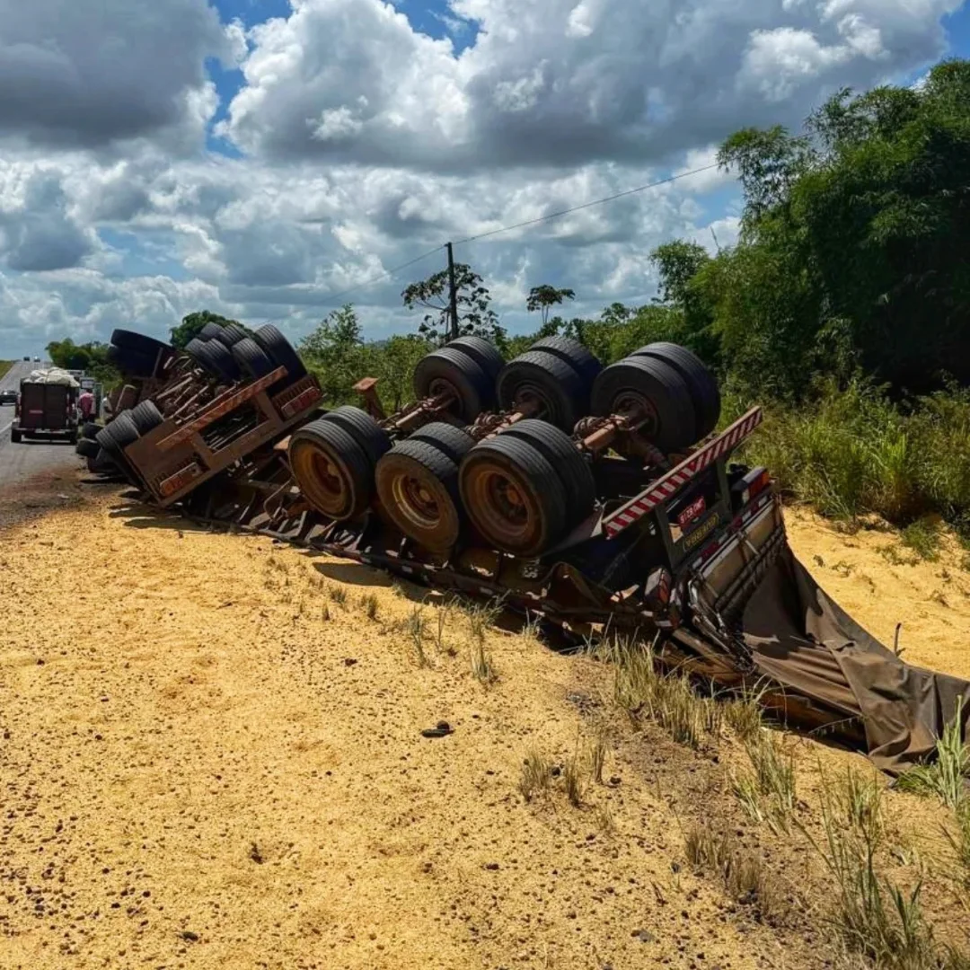 A carreta, de placa PJA-0829, transportava farelo de soja, que ficou espalhado em um barranco às margens da rodovia. Apesar do tombamento, não houve obstrução da pista, e o tráfego na BR-324 seguiu fluindo normalmente.