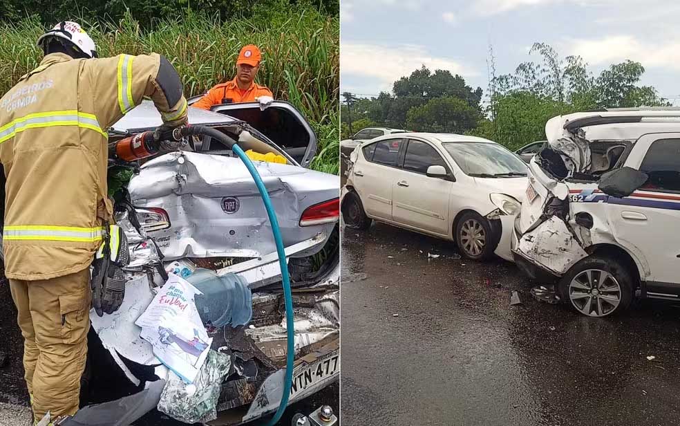 Imagens feitas no local mostram a colisão entre dois carros, com a parte traseira de um deles destruída, e um terceiro veículo sob inspeção dos bombeiros, também com a traseira destruída.