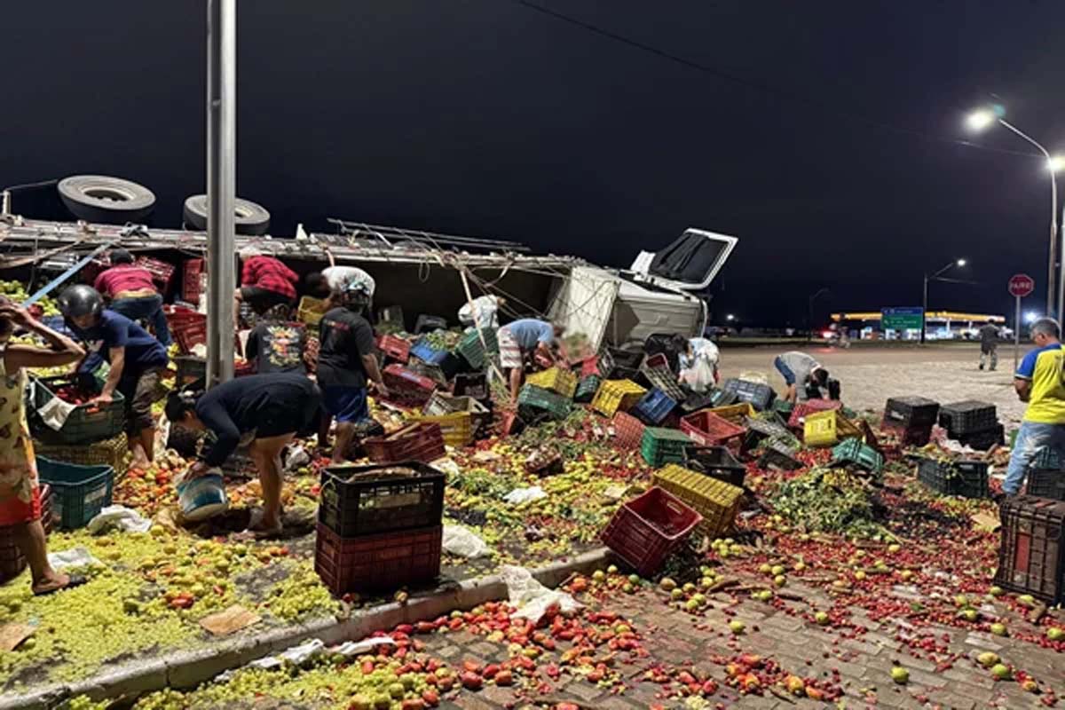 Imagens feitas por moradores da região mostram pessoas recolhendo frutas, como banana, melancia e manga, próximo ao caminhão tombado.