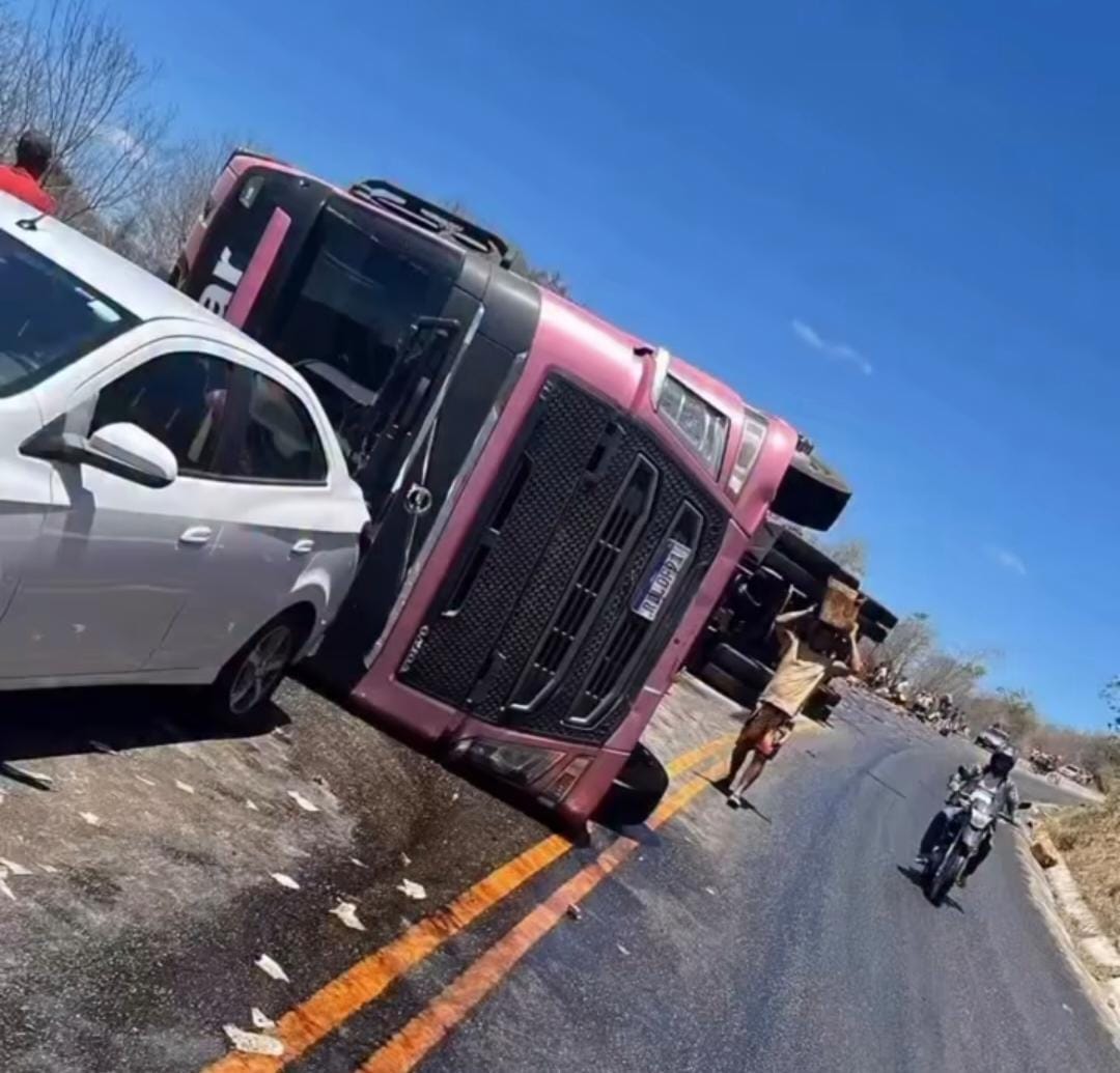 Após o acidente, a carga se espalhou pela pista e rapidamente foi saqueada por populares, que recolheram as embalagens de óleo, mesmo diante da cena delicada de resgate.