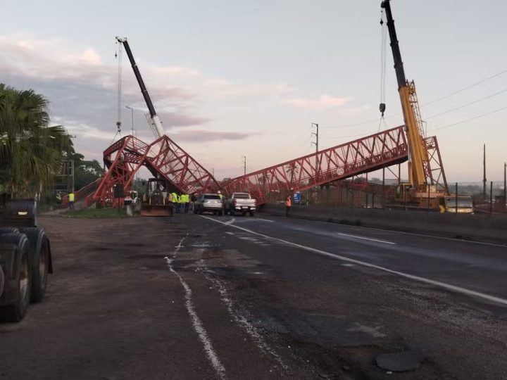 Uma passarela desabou após ser atingida por uma carreta na BR-324, próximo à cidade de Amélia Rodrigues, a cerca de 90 quilômetros de Salvador.