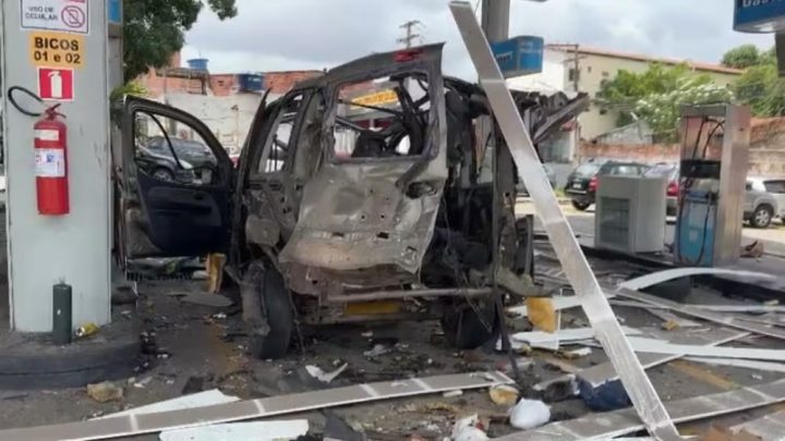 Um carro ficou destruído após explosão em cilindro, enquanto era abastecido com gás natural veicular (GNV), em um posto de combustíveis, na cidade de Camaçari, na Região Metropolitana de Salvador, na manhã deste sábado (9). Ninguém ficou ferido.