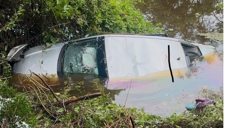 Com o impacto da colisão, um dos veículos saiu da pista e ficou submerso em uma área alagada às margens da rodovia. No carro estavam o motorista, três mulheres e uma criança.