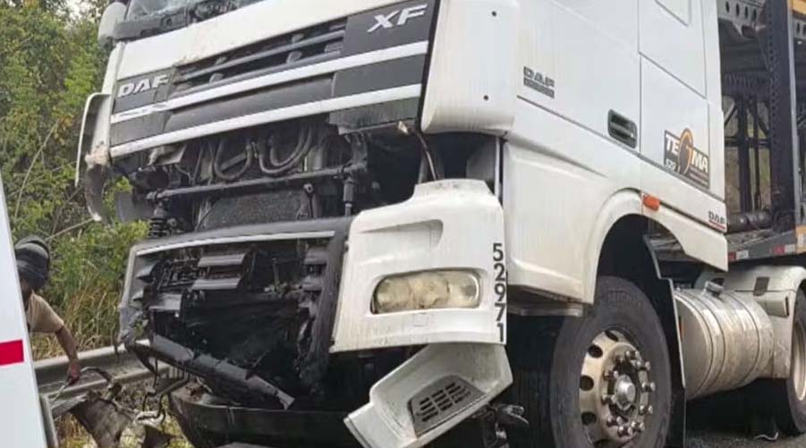 Um caminhão do tipo “cegonha”, desgovernado, não respeitou a sinalização de “pare e siga” e colidiu com a traseira de um veículo de passeio que, por sua vez, bateu em outros dois carros. O motorista do carro atingido faleceu no local.