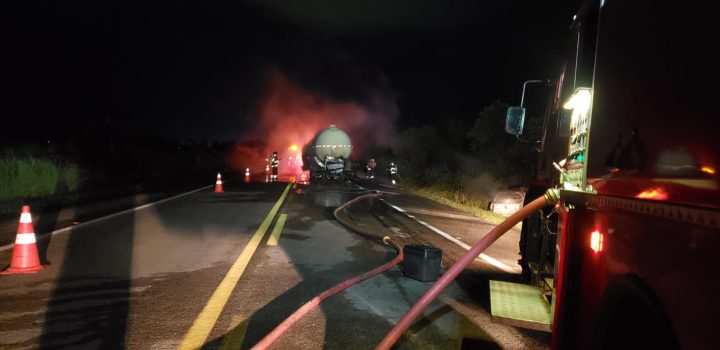 Equipes do 7° BBM retiram corpo carbonizado preso em ferragens e extinguem incêndio em caminhão tanque transportando GLP