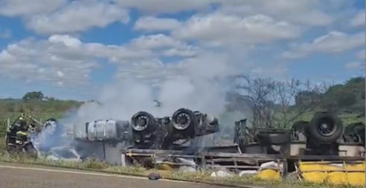 Um trágico acidente resultou na morte de um motorista que morreu carbonizado após o caminhão que dirigia tombar e pegar fogo na BA-026, trecho entre os municípios de Maracás e Planaltino, no sudoeste da Bahia.