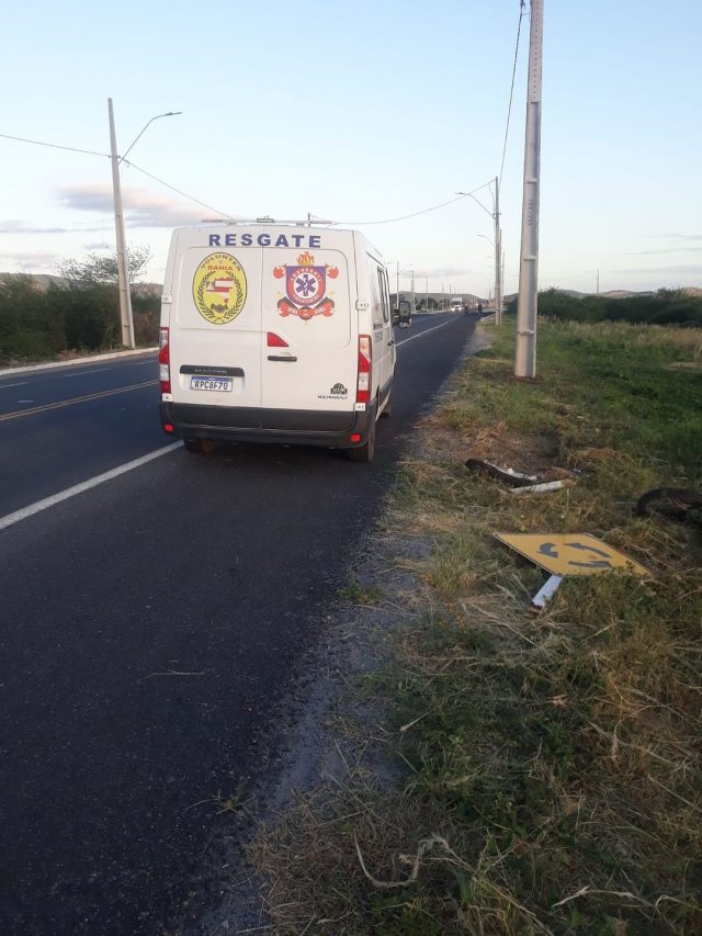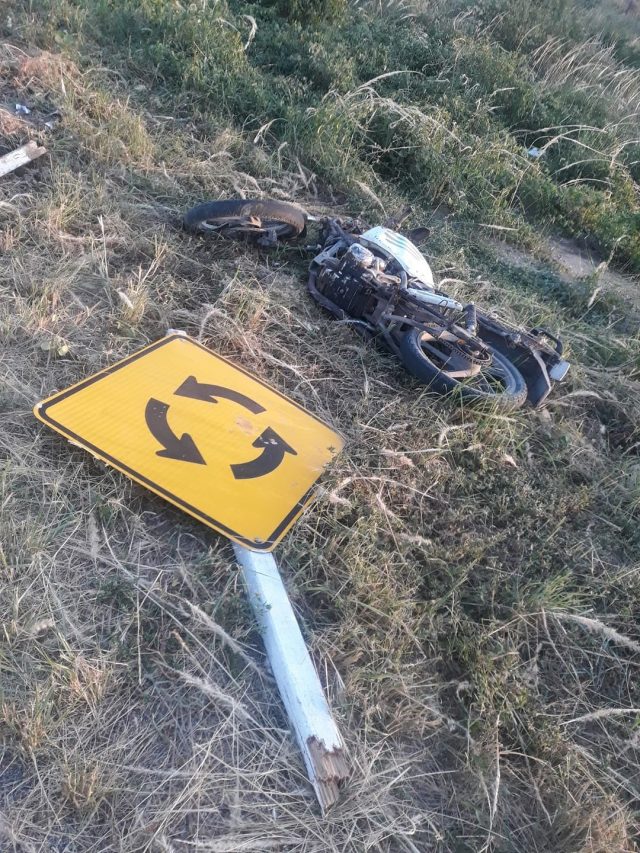 Segundo informações, o condutor de uma motocicleta perdeu o controle da moto e se chocou violentamente contra uma placa de sinalização.