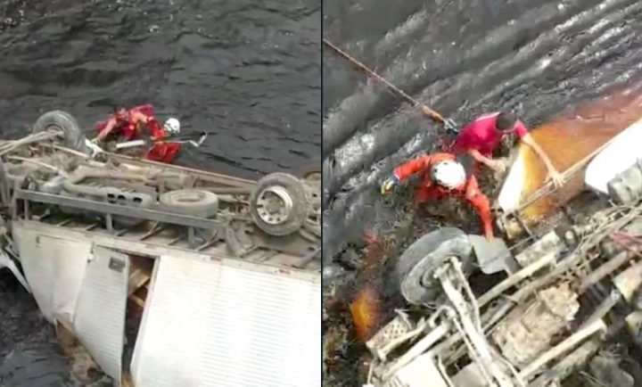 De acordo com informações do site Minha Bahia, o condutor de um caminhão perdeu o controle da direção, tombou e acabou caindo no rio.