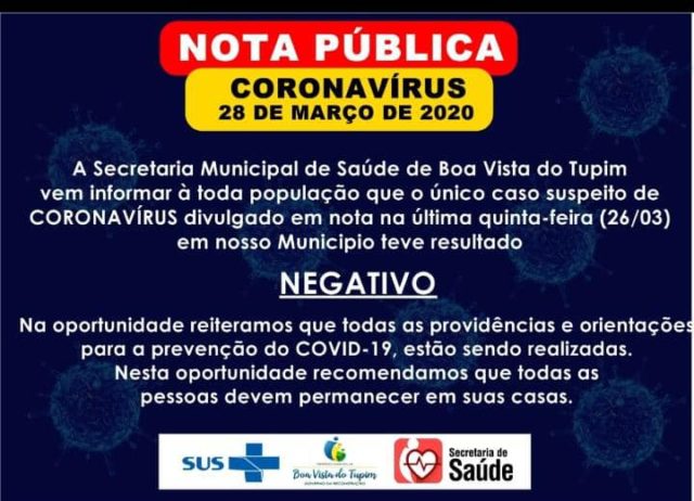 A Secretaria Municipal de saúde de Boa Vista do Tupim divulgou o resultado dos exames do caso suspeito de coronavírus.