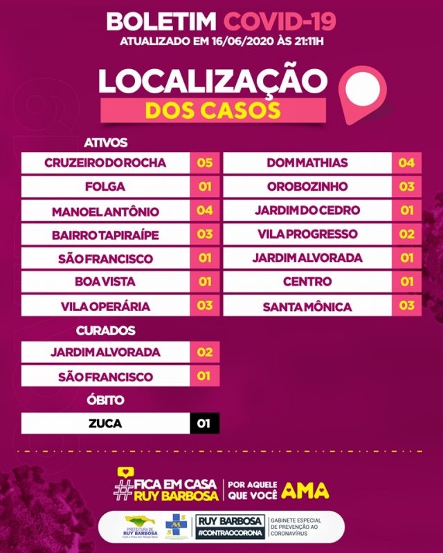 A prefeitura de Ruy Barbosa divulgou a atualização do boletim epidemiológico da evolução dos casos de coronavírus no município.