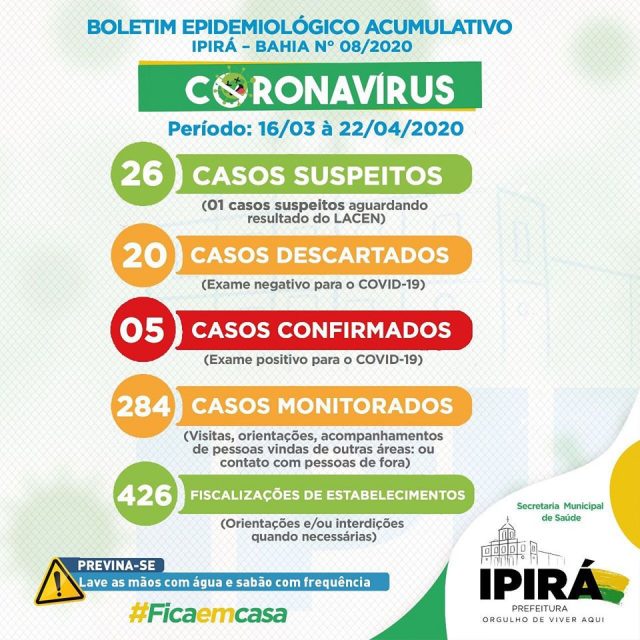 Subiu para 5, a quantidade de pessoas contaminadas por Coronavírus na cidade de Ipirá.