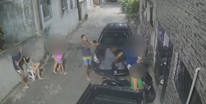 O vídeo mostra que uma família, formada adultos e crianças, conversava na porta de casa, quando um carro branco passou pelo local e parou no final da rua. Do veículo, saíram os dois suspeitos.