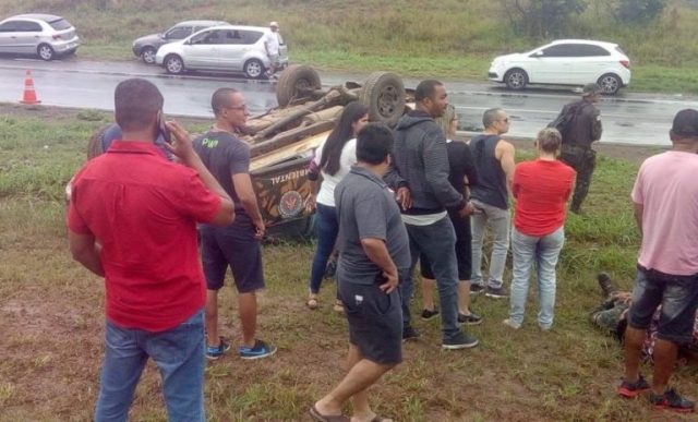 Uma viatura da Polícia Militar capotou na manhã deste domingo (24/3), na BR 324, por conta da pista molhada. O acidente aconteceu no sentido para o motorista que segue para Feira de Santana.