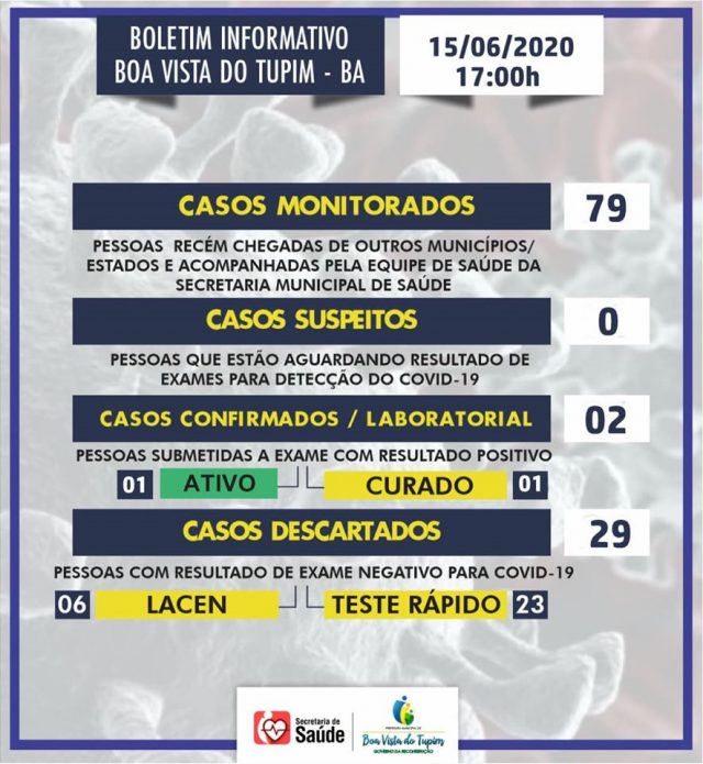 A prefeitura de Boa Vista do Tupim divulgou na tarde desta segunda-feira (15) o novo boletim epidemiológico dos casos de coronavírus na região.