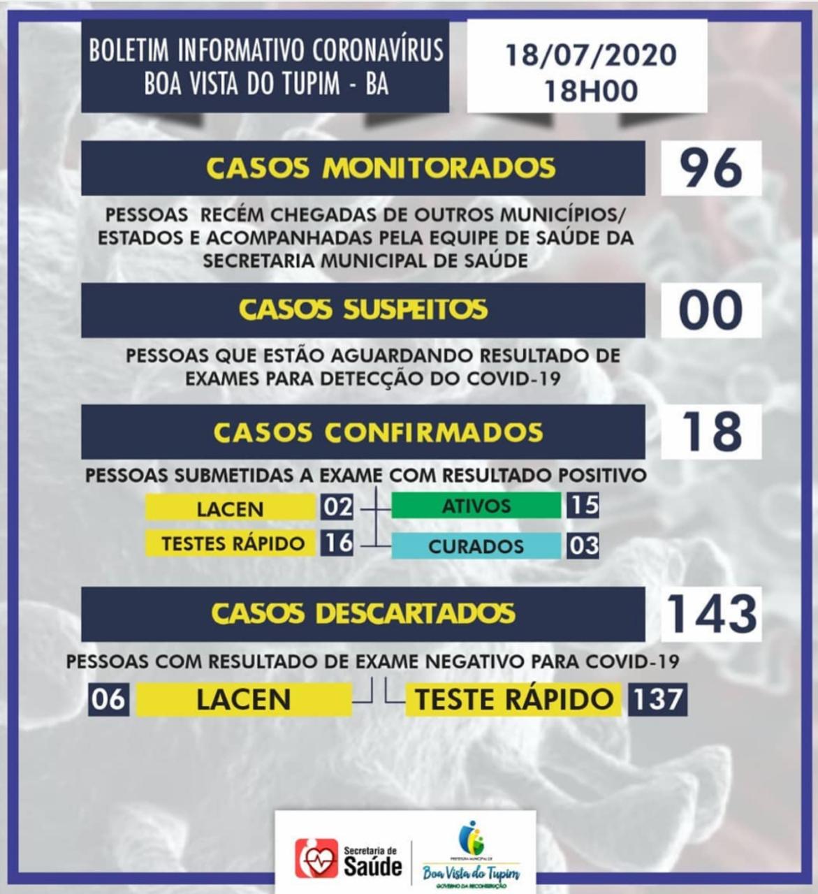 O município de Boa Vista do Tupim, divulgou na noite deste sábado (18) a atualização do boletim epidemiológico dos casos de coronavírus.