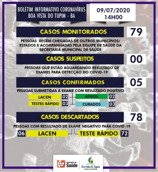 A cidade de Boa Vista do Tupim registrou 02 novos casos de coronavírus e chega a 05 casos confirmados da Covid-19.
