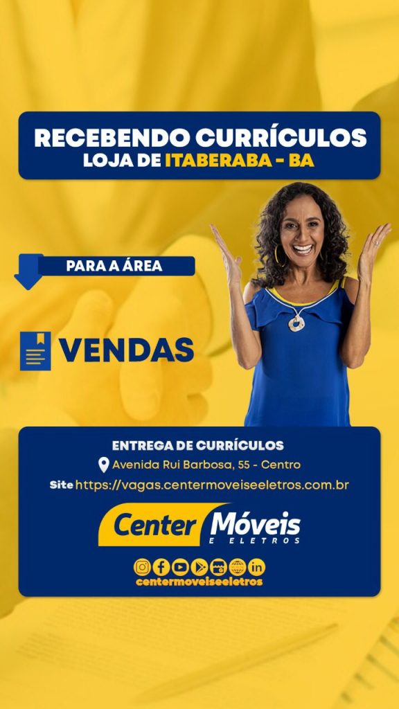 A rede de lojas Center Móveis e Eletros está recebendo currículos na cidade de Itaberaba.