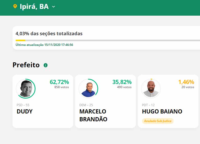 Marcelo Brandão, atual prefeito segue com pouco mais de 35% dos votos e Hugo Baiano tem 1,46% dos votos.
