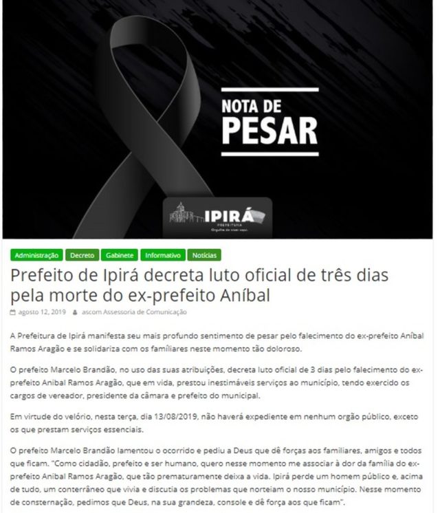 A Prefeitura de Ipirá divulgou uma nota de pesar pelo falecimento do ex-prefeito e decretou três dias de luto. No comunicado, o atual prefeito, Marcelo Brandão, lamentou o acidente e pediu forças aos familiares e amigos das vítimas.