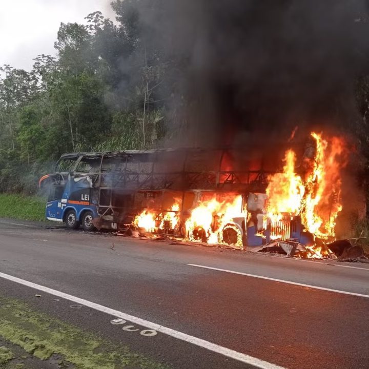 Um ônibus que fazia o trajeto entre São Paulo e Curitiba foi completamente destruído por um incêndio. O incidente ocorreu na altura de Cajati, no sul de São Paulo, quando um passageiro se trancou no banheiro do veículo e ateou fogo.