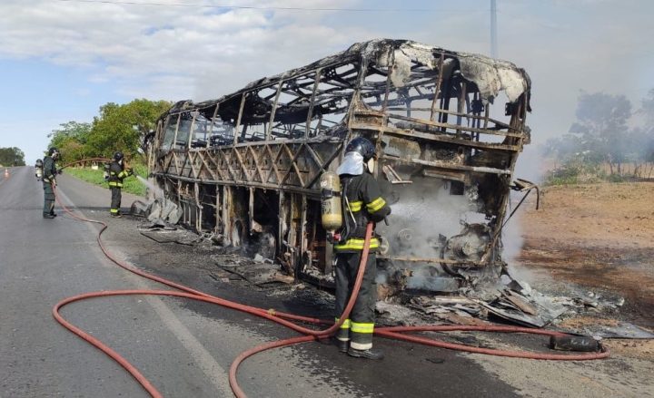 Segundo o Corpo de Bombeiros, equipes do 17º Batalhão de Bombeiros Militar (17º BBM) encontraram o ônibus em chamas quando chegaram ao local. Imagens mostram o veículo destruído enquanto agentes apagam as chamas.
