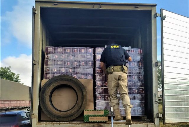 Policiais rodoviários federais apreenderam, na manhã desta quarta-feira (30), quase 15 mil litros de cerveja e mais de 10 mil pacotes de macarrão instantâneo sem nota fiscal. As mercadorias eram transportadas em um caminhão, que foi abordado pelos policiais no km 408 da BR-242, no município de Seabra.
