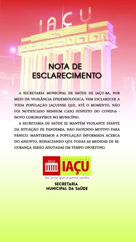 A Prefeitura Municipal de Iaçu, através da Secretaria Municipal de Saúde, também divulgou uma nota, onde esclarece que, no município não há casos suspeitos e desmentiu diversos áudios que circulam em redes sociais.