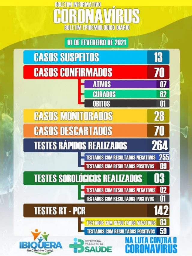 De acordo com o boletim epidemiológico divulgado nesta segunda-feira (01/02), a cidade ja contabilizou 70 casos positivos de coronavírus, sendo que 62 estão curados, 07 ativos e 01 óbito.
