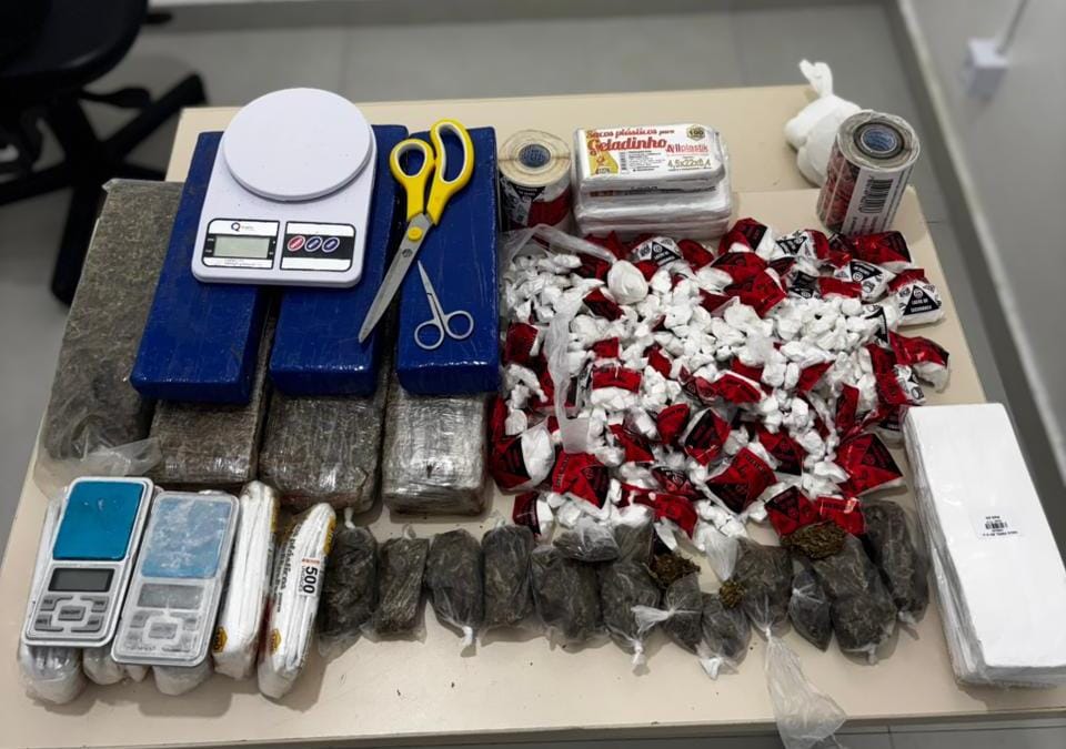 No local, foram encontradas 278 embalagens contendo cocaína, 13 porções de maconha, além de 7 tabletes da mesma substância, balanças de precisão e outros objetos utilizados pelo tráfico.