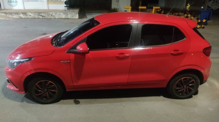 O veículo abordado foi um FIAT/ARGO de cor vermelha. Durante a fiscalização, os policiais notaram sinais de adulteração nas placas do veículo, o que motivou uma busca mais detalhada. A equipe constatou que o carro estava com os elementos identificadores adulterados e o veículo original havia sido roubado no dia 26/01/2022 na cidade de Brasília (DF)