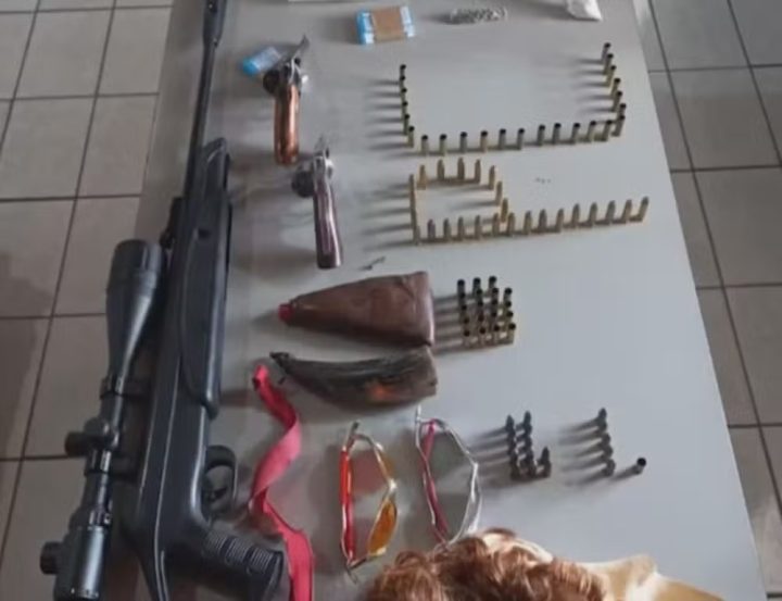 Com os suspeitos foram encontrados dois revólveres, munições, celulares, uma balança, porções de maconha e cocaína, pólvora, uma espingarda e uma máscara de disfarce.