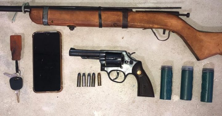 Os agentes se deslocaram para o local, identificaram o homem e o prenderam. Na abordagem, os policiais apreenderam duas armas de fogo, munições e um veículo sem qualquer documentação.