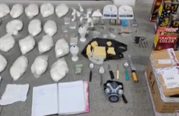 cerca de 7 kg de cocaína; pasta base de cocaína; maconha; crack; êxtase; embalagens para drogas; balanças de precisão; caderno de anotações; uma pistola; munições; carregador; facas; lâmpadas; câmeras e caixas de foguetes.