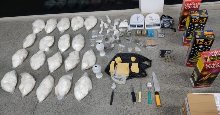 Com a suspeita, foram encontrados: uma pistola cal. 635 com um carregador e dez munições do mesmo calibre; aproximadamente 7 kg de cocaína, além de quase 1 kg de pasta base; cinco porções de crack; quatro placas de haxixe e seis porções da mesma; uma porção de maconha; seis balas de ecstasy; três balanças de precisão; uma máscara com filtro químico; uma máquina de cartão; duas lâmpadas espiãs; quatro caixas de foguetes sinalizadores; uma mala contendo diversas embalagens para acondicionamento de entorpecentes e diversos utensílios para manipulação de drogas.