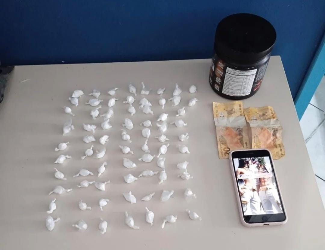 Durante a busca pessoal e domiciliar, os agentes encontraram 72 papelotes de cocaína, acondicionados em sacolas plásticas, além de R$ 40 em espécie e um aparelho celular iPhone branco.