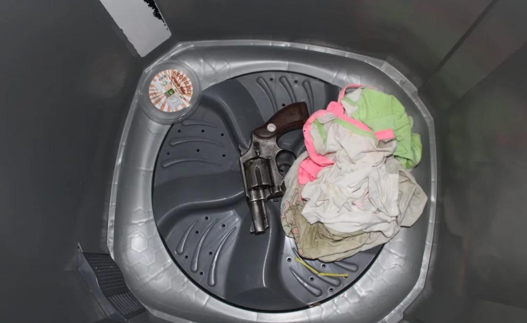 O revólver estava escondido dentro de uma máquina de lavar roupas, indicando tentativa de ocultação. Todo o material será encaminhado para perícia.