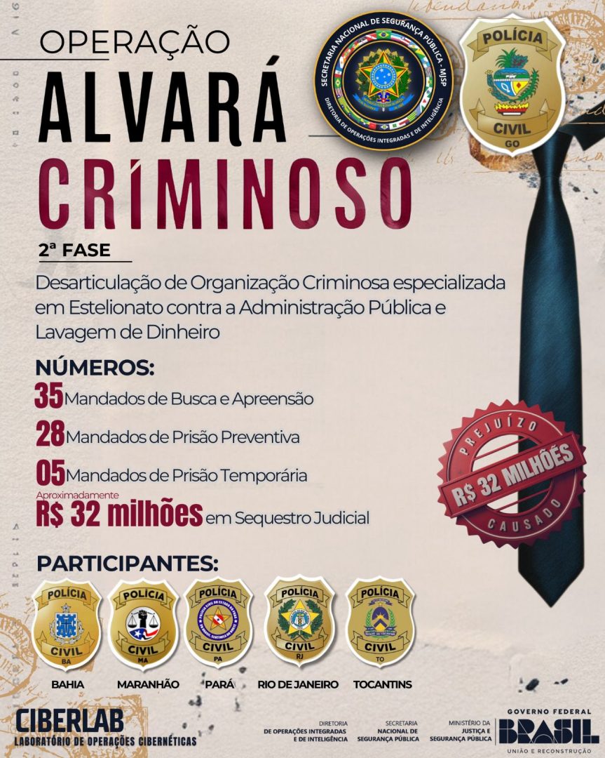 O preso é alvo da Operação Alvará Criminoso (2ª fase), deflagrada em 19/06/2024 pela Polícia Civil de Goiás, com apoio do Laboratório de Operações Cibernéticas (CIBERLAB/DIOPI/SENASP) do Ministério da Justiça e Segurança Pública.
