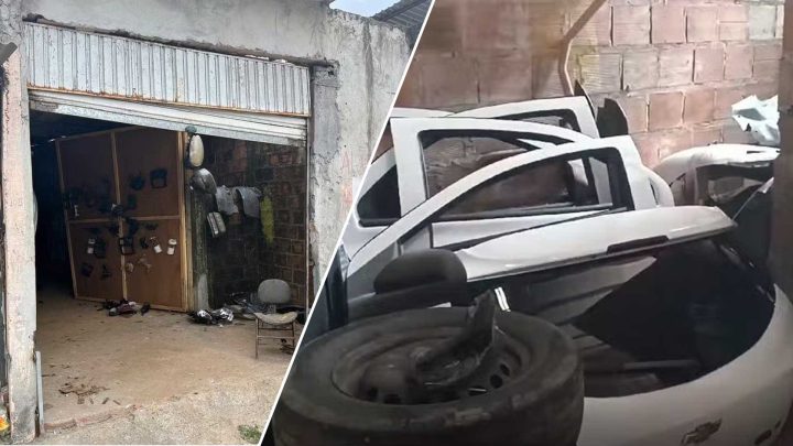 Os policiais receberam informações sobre a atividade ilegal e, ao chegarem ao local, encontraram uma edificação abandonada onde estavam dois carros em processo de desmanche: um Ônix branco e peças de um Nissan Versa.