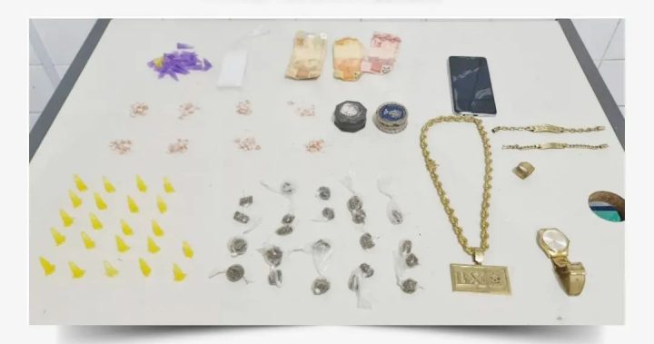 22 “trouxas” de substância aparentando maconha, 22 “pinos” de substância aparentando cocaína, 78 pedras de substância aparentando Crack, 01 celular Infinix, R$ 80,00 em espécie, 01 relógio, 02 pulseiras, 01 corrente e 01 anel.
