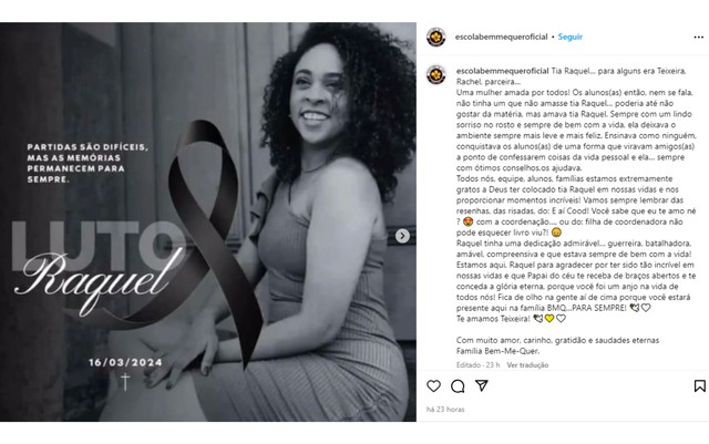 “Sempre com um lindo sorriso no rosto e sempre de bem com a vida, ela deixava o ambiente sempre mais leve e mais feliz. Ensinava como ninguém, conquistava os alunos(as) de uma forma que viravam amigos”, escreveu.